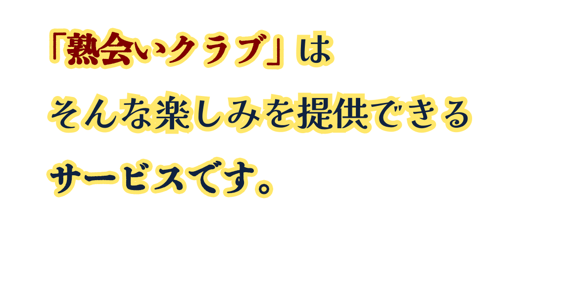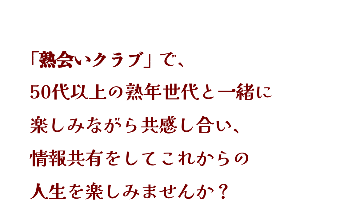 熟会いクラブは、共感を大切にしたサイトです。同じ趣味や興味を持つ人と共感することで、熟年層の方々に新しいワクワクやドキドキを提供します。